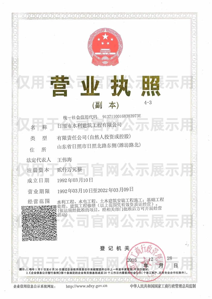 日照市水利建筑工程有限公司前身為日照市水利局安裝隊(duì),隸屬于日照市水利局,成立于1992年3月,注冊資本2000萬元,主要從事水利工程施工。公司現(xiàn)有從業(yè)人員180余人,其中高級工程師10人,中級工程師46人,助理工程師52人,一級建造師3人,二級建造師17人,公司年可完成建筑安裝產(chǎn)值超1.5億元。公司現(xiàn)擁有水利水電施工總承包貳級資質(zhì),并先后通過了質(zhì)量管理體系認(rèn)證ISO9001:2015、環(huán)境管理體系認(rèn)證ISO14001:2015、職業(yè)健康管理體系ISO45001:2018等體系認(rèn)證,2020年12月榮獲山東省水利廳“水利安全標(biāo)準(zhǔn)化二級單位”等證書。
